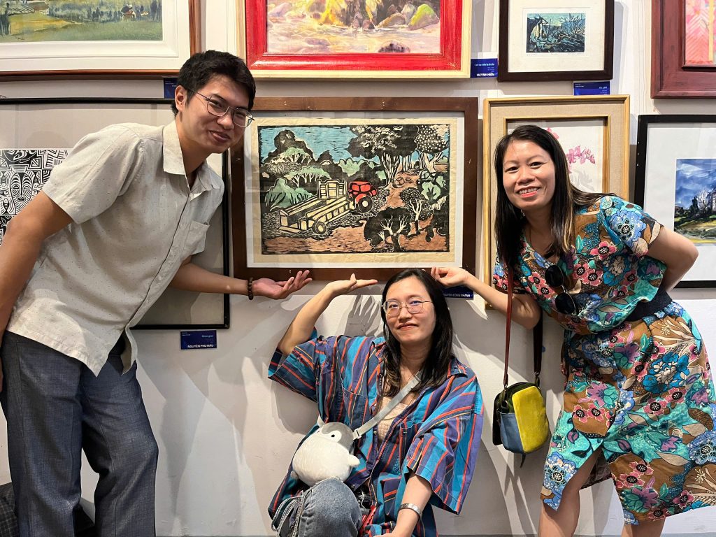 Các giáo viên Xưởng Vẽ chụp hình lưu niệm bên tác phẩm của mình tại triển lãm