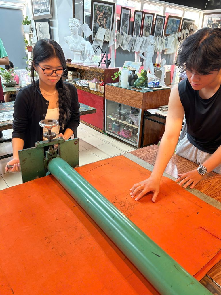 Học viên được tự mình trải nghiệm khắc gỗ, lăn mực, in tranh bằng máy in chuyên nghiệp