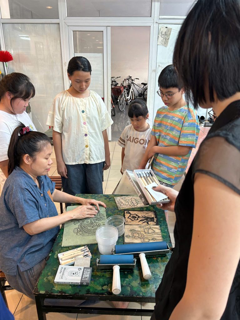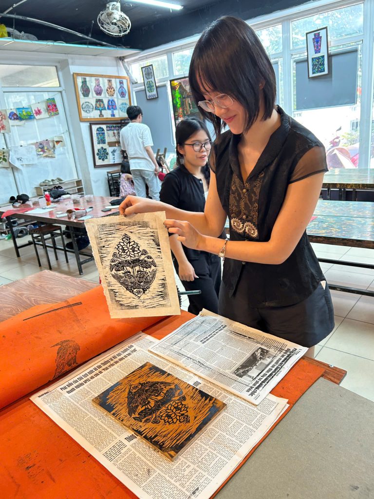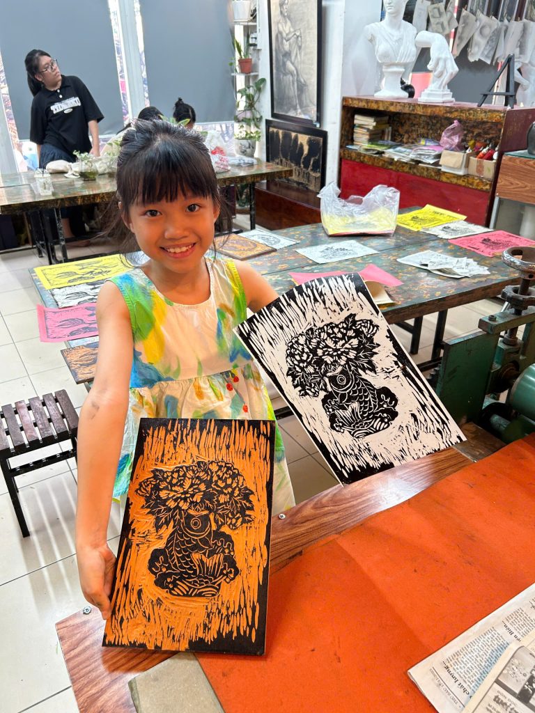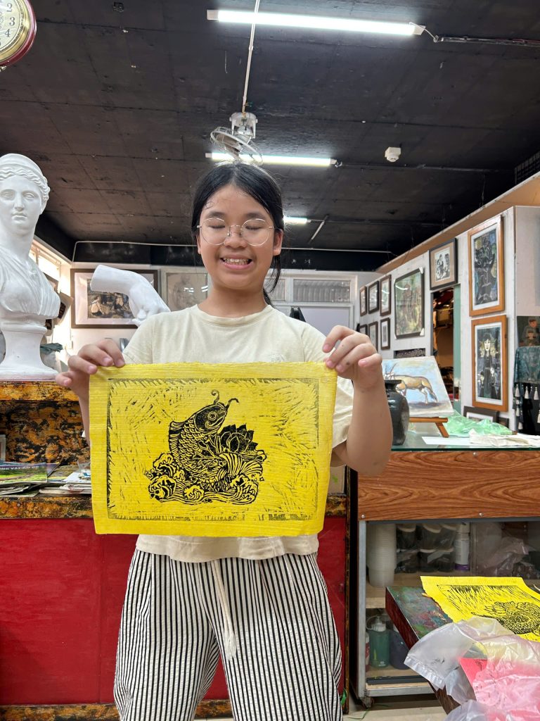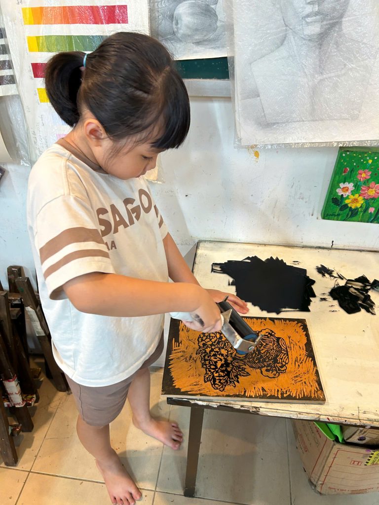 Các em nhỏ đặc biệt hào hứng khi tự tay tạo nên những bản in đầu tiên của mình. Từng đường khắc tuy còn ngây ngô nhưng chứa đựng sự tập trung, kiên nhẫn và niềm vui khám phá.