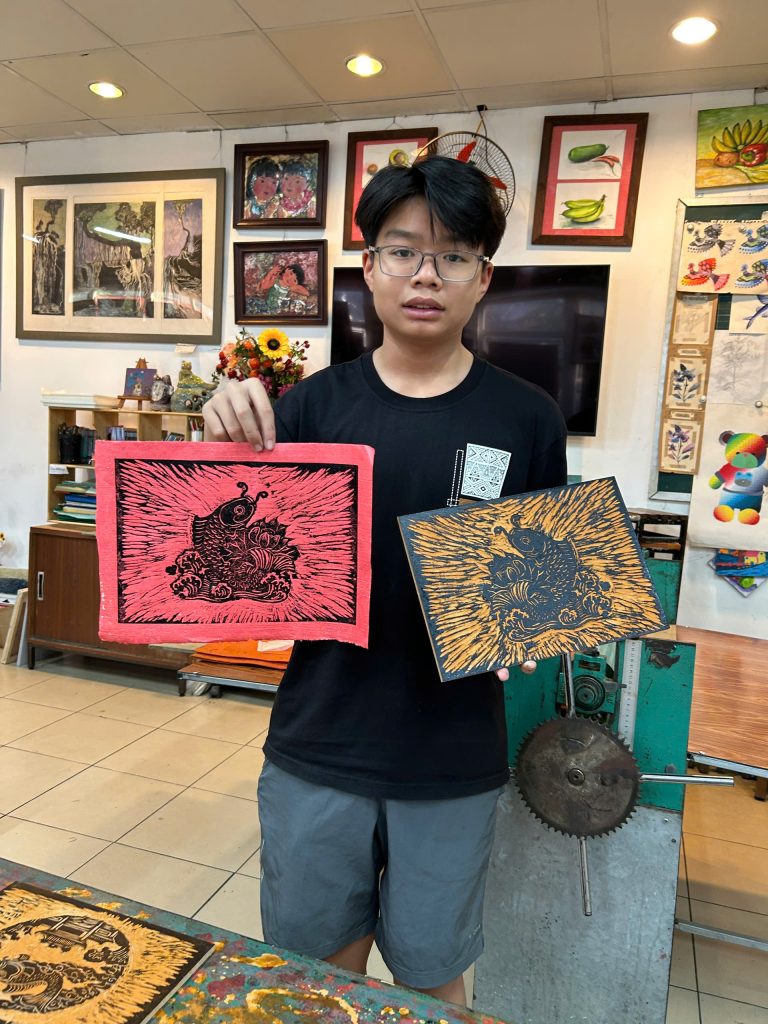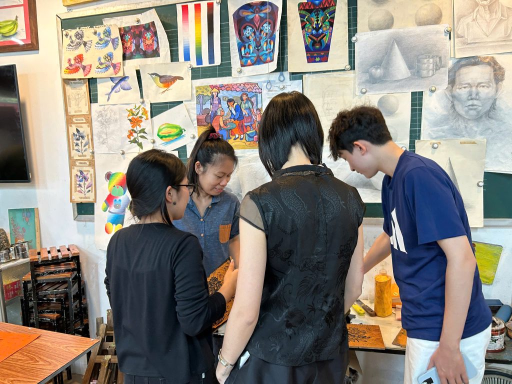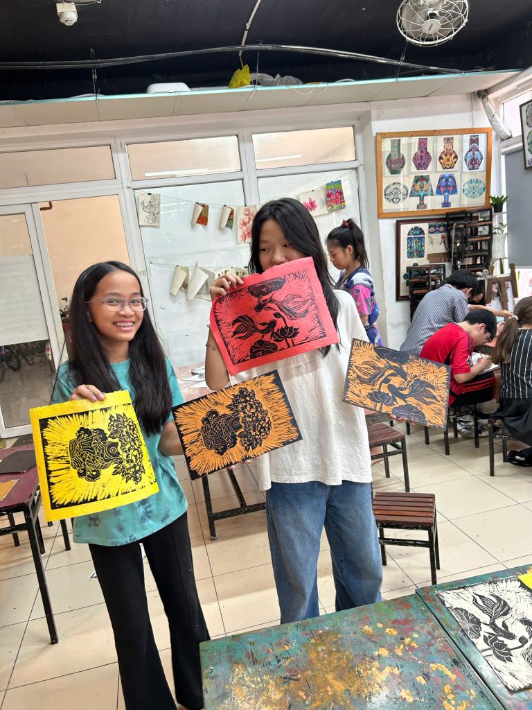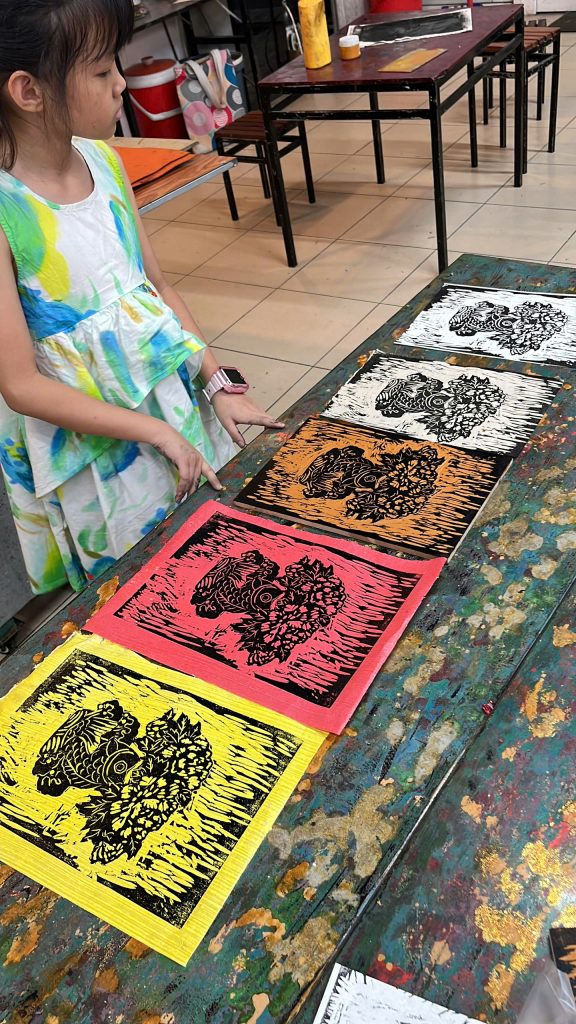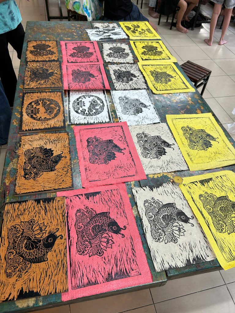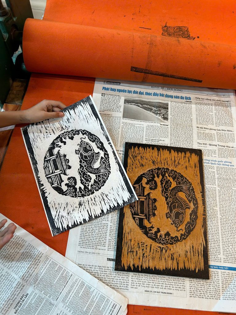 Các em nhỏ đặc biệt hào hứng khi tự tay tạo nên những bản in đầu tiên của mình. Từng đường khắc tuy còn ngây ngô nhưng chứa đựng sự tập trung, kiên nhẫn và niềm vui khám phá.