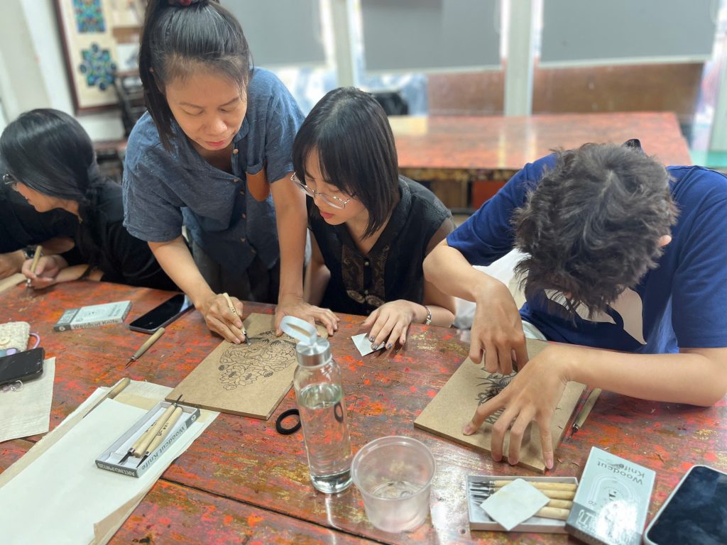 Giáo viên hướng dẫn từng công đoạn từ mài dao, khắc đến in